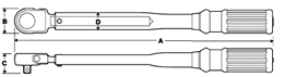 | Model | Range | Graduation | Sq. Dr. (in.) | A (mm) | B (mm) | C (mm) | D (mm) | Weight (kg) | |